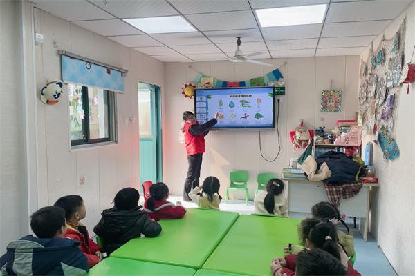 图为志愿者们和小一又友进行看图识树互动。