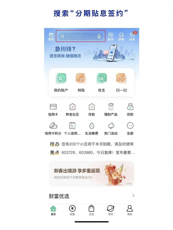 一是多渠谈粗陋签约。客户可通过手机银行信用卡贴息专区、拨打信用卡客服热线(4006695599)或在办理账单分期时按系统指示三种格式完成财政贴息补充契约签署。手机银行签约旅途:手机银行首页搜索“分期贴息签约”—点击“去稽查”插足分期贴息专区—礼聘信用卡卡号—点击“去签约”。