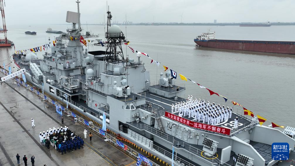 4月23日,在舟师降生地江苏泰州,舟师泰州舰官兵举行升旗庆典(无东说念主机像片)。新华社发(厚泽轩 摄)