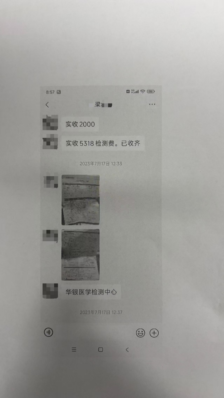 2026年1月,小王在其家属的随同下,来到报社进行投诉,并向记者提供了磋磨根据材料,包括磋磨检测讲述、与梁先生的微信聊天记录、转账凭证以及报警回执。聊天记录败露,梁先生明确送检机构为“华银医学检测中心”,并提供了该中心的检测肯求单。