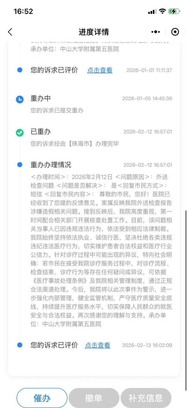 记者获悉,在患者家属向12345平台投诉后,2026年2月12日,患者收到平台的复兴。中山五院院方在回复中暗示:病院历久坚执照章执业、诚信行医,执意根绝各种违规非法行恶医疗活动,切实爱戴患者正当权利和医疗行业公信力。并以这次事件为警示,欢跃将进一步强化里面经管。