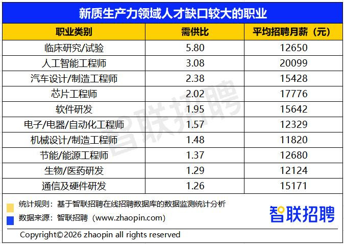 敷陈指出,从供需相干看,节后一个月,新质界限技艺岗亭无数濒临东谈主才短少,企业正发力抢东谈主才。智联招聘数据清楚,临床商榷/检修岗亭需供比达5.8,即每个求职者对应近6个招聘岗亭,东谈主才缺口最为隆起。