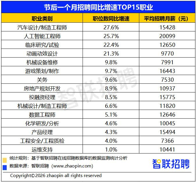 敷陈称,节后一个月,汽车设想/制造工程师以27.6%的职位数同比增速领跑事业榜单,平均招聘月薪15428元,反馈智能化、电动化车辆捏续带来复合型东谈主才需求。东谈主工智能工程师同比增长25.7%,月薪超2万元,是节后一个月同比增速TOP15事业中薪酬最高的事业。临床商榷/检修岗增速22.4%,华体会体育位列第三,月薪12650元,医药产业链在加速推动东谈主才吸纳。