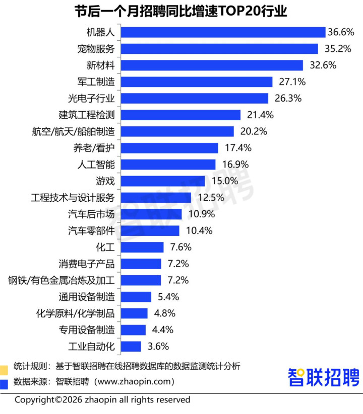 敷陈清楚,节后一个月招聘同比增速TOP20行业中,新质出产力规划行业占据榜单主体。收货于自动化校阅、智能装备升级带来的东谈主才需求增多,机器东谈主行业以36.6%的职位数同比增速领跑。新材料(职位数同比增速32.6%)位居前方,产业链蔓延使研发、工艺、品控岗亭彭胀明显。军工制造(27.1%)、光电子行业(26.3%)、航空/航天/船舶制造(20.2%)、东谈主工智能(16.9%)等行业同比增速均超在2-3成,彰显高端技艺型行业韧性。