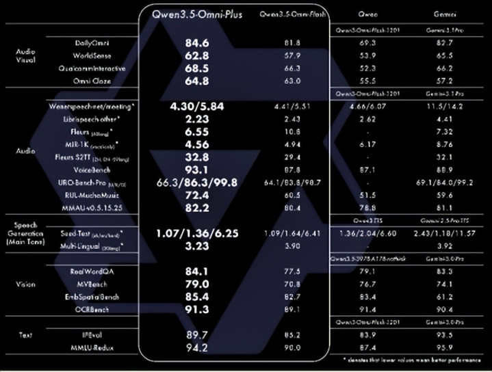 Qwen3.5-Omni接受夹杂慎重力MoE架构,在海量文本、视觉以及逾越1亿小时的音视频数据上进行了原生多模态预老师,可齐备图片、视频、语音、笔墨等全模态现实的输入与输出。新模子在音视频连气儿、跨模态推理、Agent方面齐备了性能飞跃,在音视频连气儿、语音识别、多语种翻译、对话等215项第三方性能测试任务中获得SOTA。比如,在聚焦视听交互才气的DailyOmni、QualcommInteractive、Omni Cloze等测试中,Qwen3.5-Omni得分大幅起始Gemini-3.1 Pro;在检测嘈杂环境抗骚扰才气的WenetSpeech测试中,米兰Qwen3.5-Omni装假率远低于Gemini,识别准确率极高;在磨真金不怕火多说话语音生成质料的Multi-Lingual (30lang) 测试中,Qwen3.5-Omni雷同显耀优于Gemini-2.5-Pro-TTS。