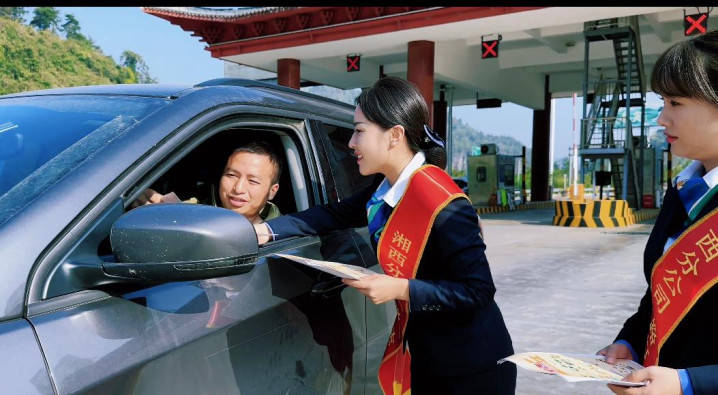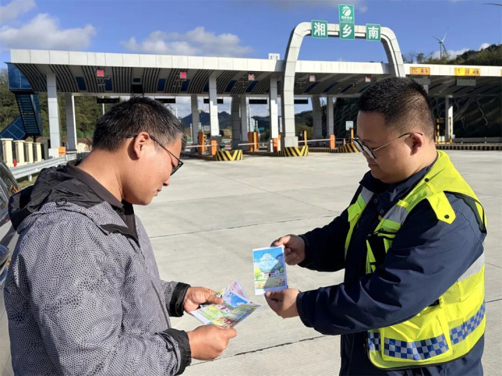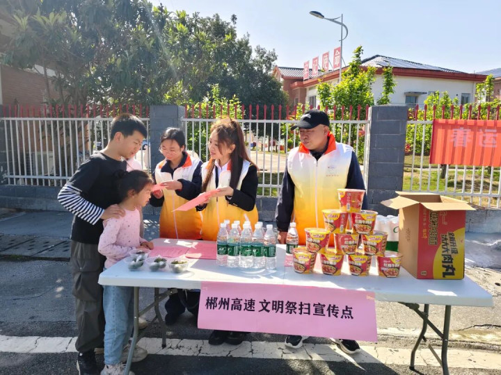 韶山中心收费站前,“街灯”志愿者相配致力于。这里不仅是通往伟东说念主故里的交通家数,更化身为传递慈祥的“好意思丽驿站”。收费广场旁特设“好意思丽祭扫宣传点”,责任主说念主员深情诠释韶山红色故事,引得过往司乘安身凝听。