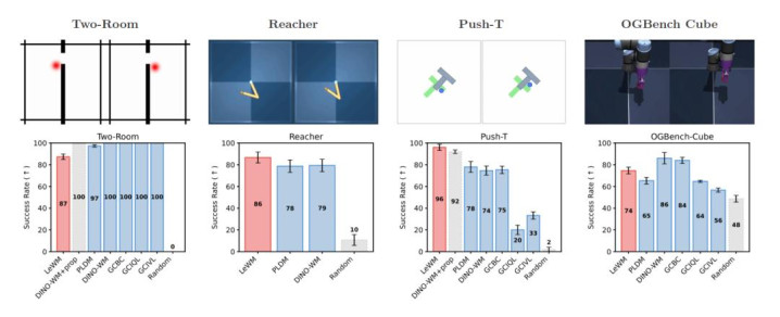 图 | LeWM 在不同任务测试中的弘扬(开端:上述论文)