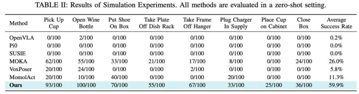 在皆备不需要教训和任务特定微调的情况下,Goal-VLA 在仿真与真确全国中,跳动不同的操作任务、环境、物体类别以致机器东谈主实质,均展现出了雄厚的零样本泛化才智。