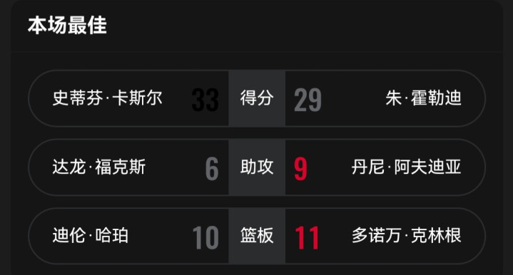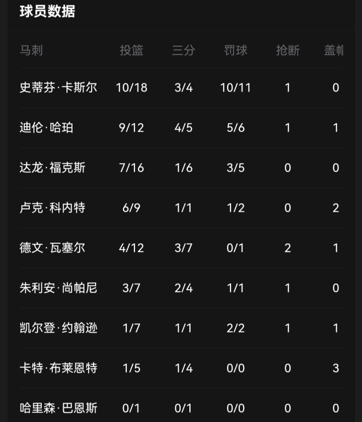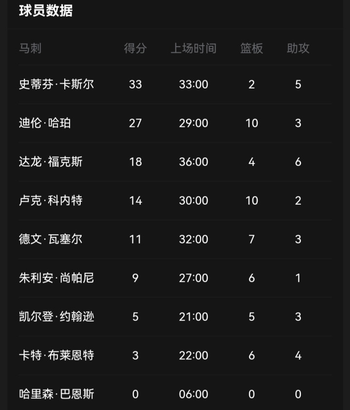 要说马刺队今天赢球的最大元勋,无疑是卡斯尔,他全场18投10中,三分球4投3中,罚球12罚11中,拿到季后赛33分新高的同期还抢下2个篮板,送出5次助攻,1次抢断的优秀数据!