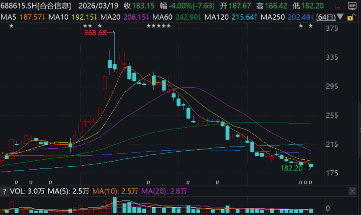 2025年年报走漏后,合合信息的股价近日并未出现大幅波动,该股3月19日收盘时下降4.00%,报收183.15元/股,总市值跌至256亿元驾驭。