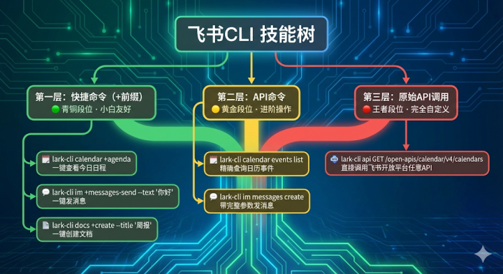 飞书CLI的敕令系统联想成了三层架构,就像游戏里的妙技树——你不需要全部点满,凭据我方的段位选择就好。
