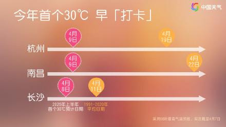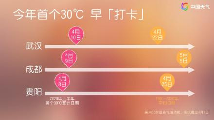 8-9日,由于雨带暂时北抬,西南地区东部到江南快速升温、冲击新高,最高气温将多数逾越30°C,杭州、长沙、南昌、成皆、贵阳今明两天皆将纷纷迎来本年首个30°C+。