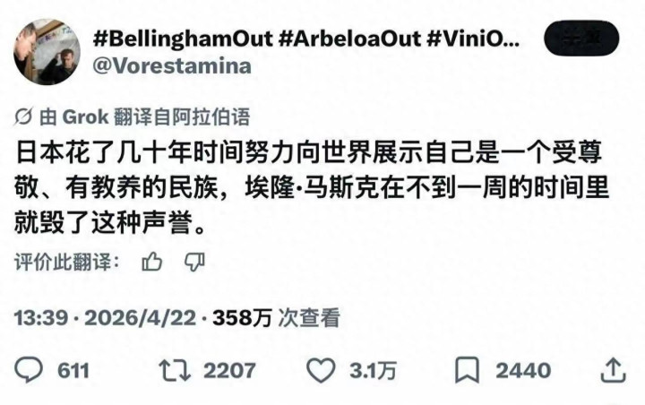 这得从2026年3月底提及。马斯克旗下的X平台作念了一次更新——强化保举算法,全面激活AI及时翻译。初志很浅显,想让全球用户跨言语刷本体,别各自闷在信息茧房里。