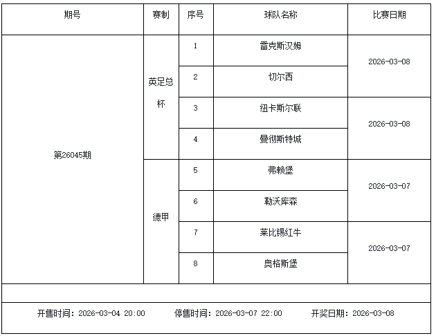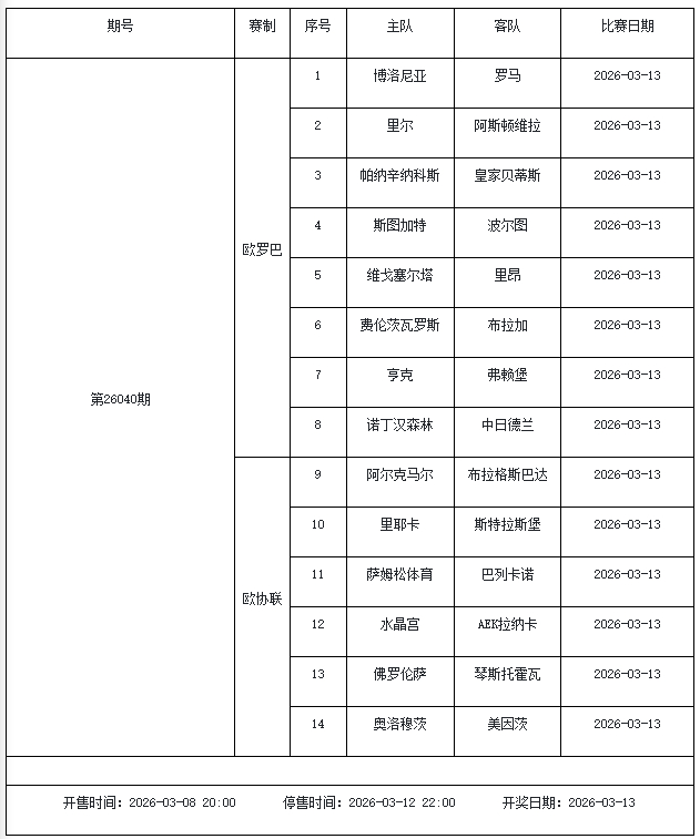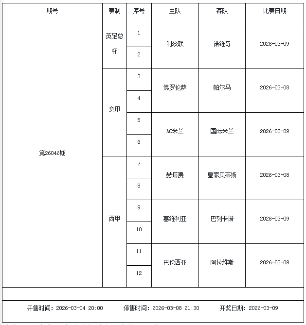 我中心制定了2026年中国足球彩票输赢游戏(14场、任选9场)、6场半全场输赢游戏和4场进球游戏3月6日-3月12日的竞猜场次安排(具体附后),其竞猜对象、开售本事、停售本事和计奖本事均以本文为准。