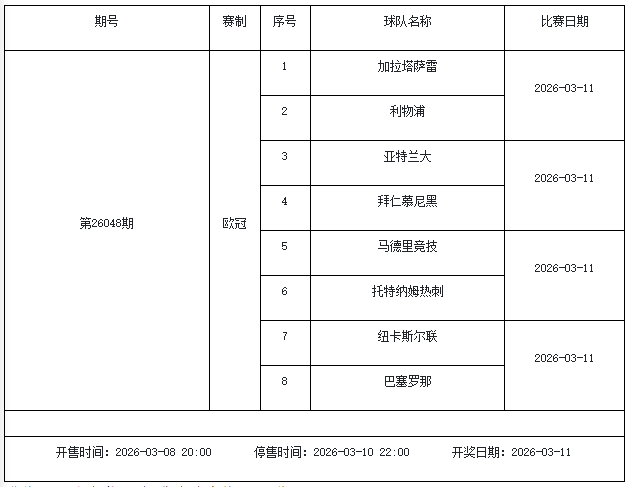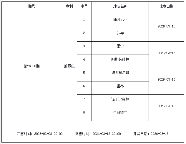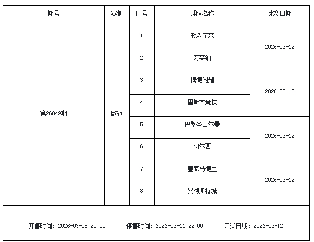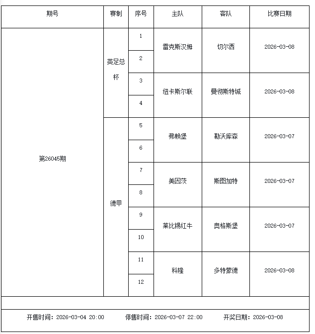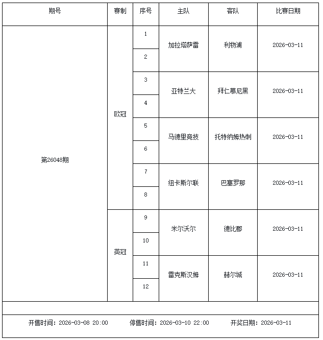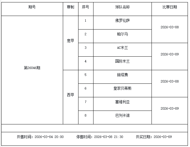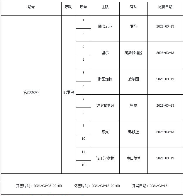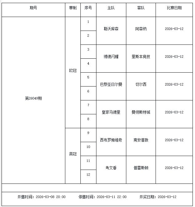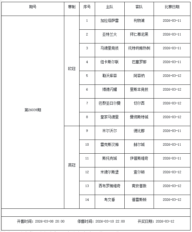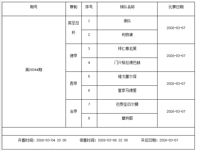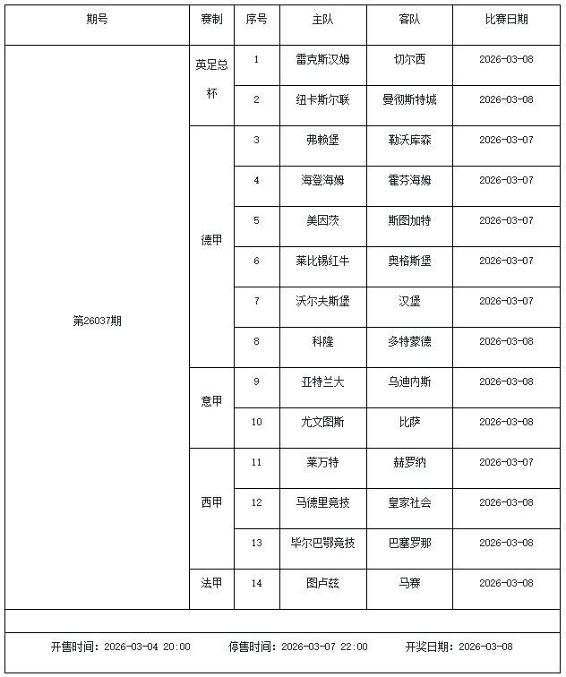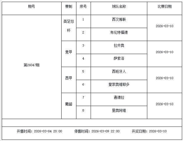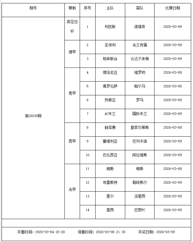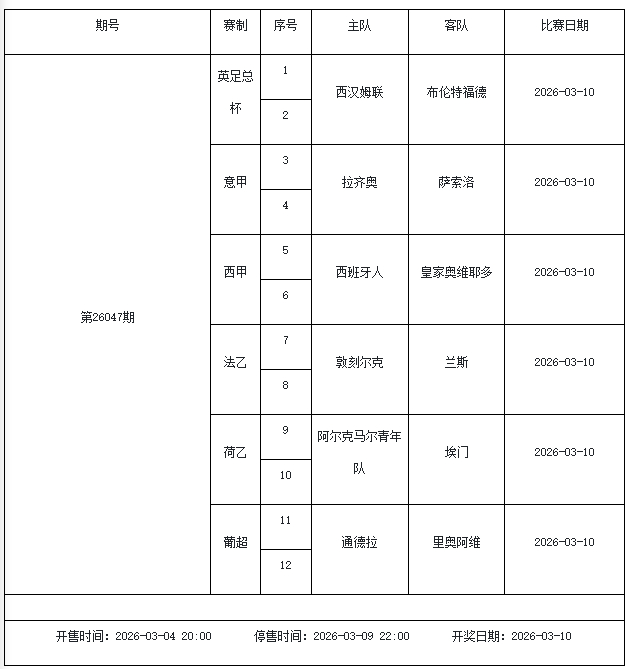 北京本事2026年3月3日,国度体彩中心公布了2026年3月6日-3月12日的足彩赛程,华体会体育3月6日(周五)、3月7日(周六)、3月8日(周日)、3月10日(周二)、3月12日(周四)共5期。其中26036期包含足总杯英冠德甲等10大赛事混猜、第26037期、26038期由英德意西式5国比赛构成、26039期竞猜欧冠英冠、26040期竞彩欧罗巴欧协联。