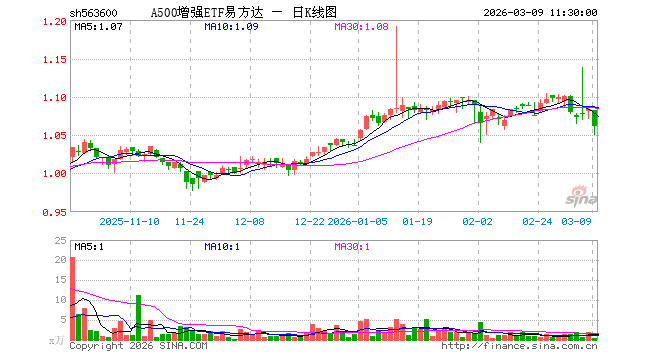 3月9日,截至午间收盘,A500增强ETF易方达(563600)跌2.03%,报1.061元,成交额43.57万元。A500增强ETF易方达(563600)重仓股方面,宁德时期截至午盘跌1.52%,米兰贵州茅台跌0.42%,中国吉利跌2.79%,中际旭创跌6.14%,招商银行跌0.77%,华体会体育app紫金矿业跌3.15%,好意思的集团跌1.33%,新易盛跌7.06%,兴业银行跌0.86%,中信证券跌2.35%。