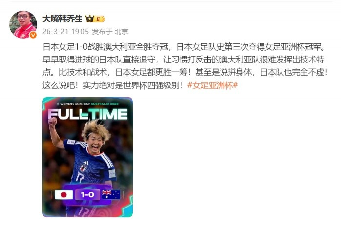 直播吧3月21日讯女足亚洲杯决赛,日本女足1-0打败澳大利亚女足,夺得冠军。赛后韩乔生社媒发文点评日本女足进展,以为日本女足在技战略水平上皆更胜一筹,拼体格也不虚,华体会体育app官网实力富裕是天下杯四强级别。