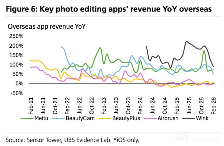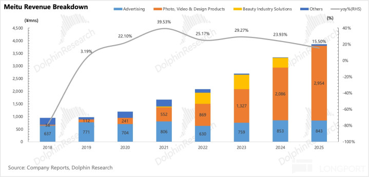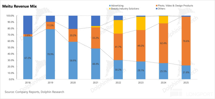 综上,C 端基本盘逻辑受挫,估值大幅下杀,但好在竞争时势仍属良性。C 端业务以近 2.5 亿的用户体量占据了公司业务重点。字据 UBS 月度跟踪数据,居品的 MAU 份额较为踏实,好意思图系在国内图片剪辑赛谈仍是龙头。视频剪辑方面,Wink 在国外迎来全面爆发,同字节系剪映造成互异化竞争,全年收入同比增速稳居 100 pct 以上高位。但赛谈 MAU 份额抓续收缩,相连下半年欠佳的 MAU 数据,大模子关于轻度用户的争夺是弗成幸免的。但相对的,用户结构终昭着优化。因此,C 端方面,海豚君不提议过度怜惜 MAU 边缘变化,订阅浸透(隐含功能对中重度用户的诱导)及 ARPPU 普及(隐含国外孝敬价值量)是更为迫切的。
