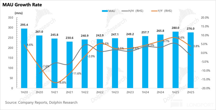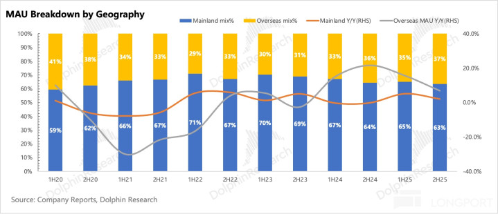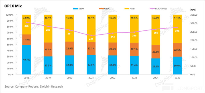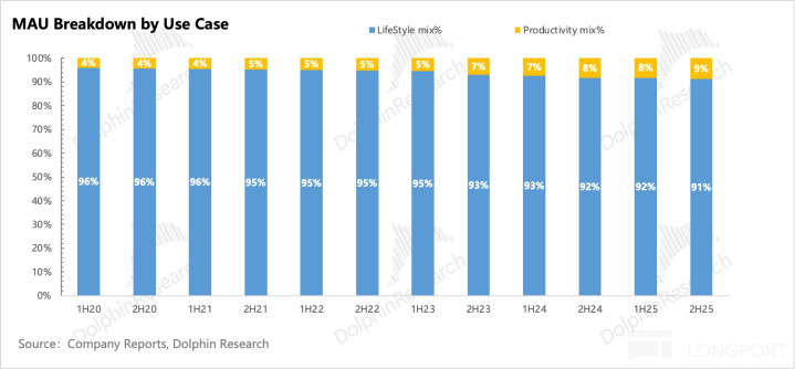 a) MAU:电话会针对下半年 MAU 的逆增长进行了阐扬,然而单从国内糊口场景居品参加纯熟期而增速放缓进行了阐扬。但海豚君更为怜惜的坐褥力场景 MAU 仅 2400 万并未获得复兴,尽管从用户结构来看 B 端仍处于浸透阶段,但增速上自 2023 年的 36.83% 大幅下滑至 2025 年 8.17%。