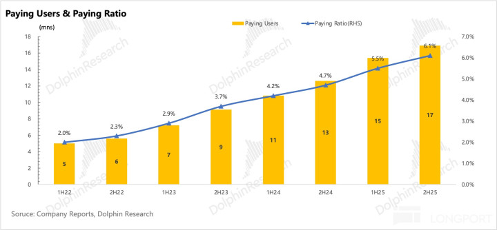 - 从增长体量来看,上半年订阅东谈主数增长 280 万,下半年增长下滑到仅 150 万。且接头到举座 MAU 出现下滑,订阅浸透率的 In-line 一定进度上是分母缩减带来的被迫普及,履行滚动质地需要打个扣头。