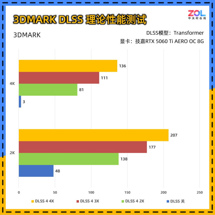 在关于建树条目相对较低的二游中,技嘉RTX 5060 Ti AERO OC 8G显卡阐发更为出色,在DLAA原生疏辨率下,2K分辨率也曾拿下281帧的成绩,诚然由于显存领域,4K分辨率下落至50帧,关联词DLSS的稳重说明让帧数跃升至200帧以上。
