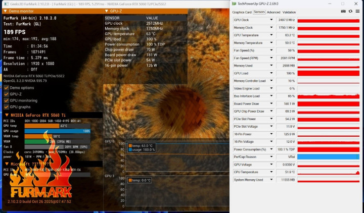 最后咱们使用FurMark 2对技嘉RTX5060 Ti AERO OC 8G显卡进行长达30分钟的满负载压力测试,监测其功耗、中枢温度、显存温度及频率阐发,测验其散热与能效比。