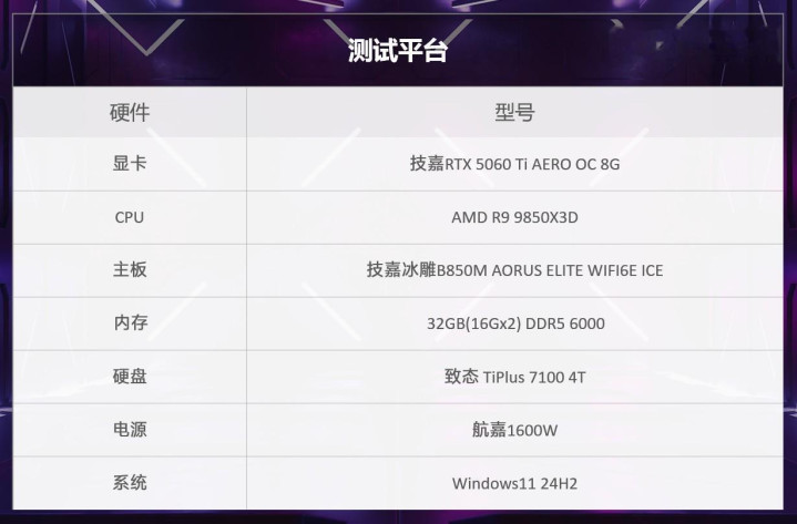先容一下测试平台,为了保险技嘉RTX 5060 Ti AERO OC 8G显卡的性能说明,咱们使用了AMD R9 9850X3D搭配技嘉冰雕B850M AORUS ELITE WIFI6EICE主板。
