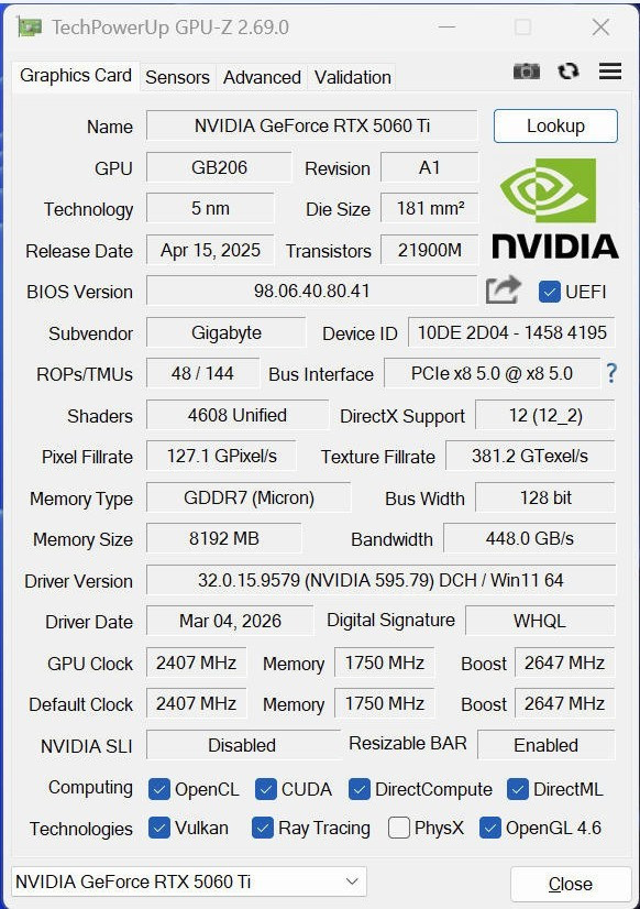 通过GPU-Z信息可得知,这款显卡搭载了完整的GB206中枢,领有4608个CUDA中枢,还有144个纹理单位、48个ROP单位。显卡中枢基础频率2407MHz,Boost频率进一步擢升达到2647MHz,超频后劲不俗;显存建树为8GB GDDR7,显存位宽128bit,显存带宽高达448GB/s,大幅擢升数据读写速率。