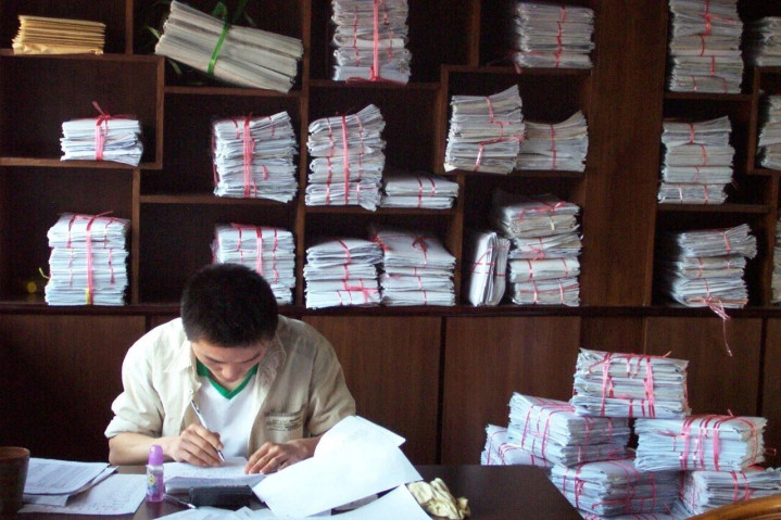 第二十届浙江省少年体裁征文活动的截稿日(4月15日)周边。浙江省青少年作者协会门前堆满了从全省各地寄来的稿件。
