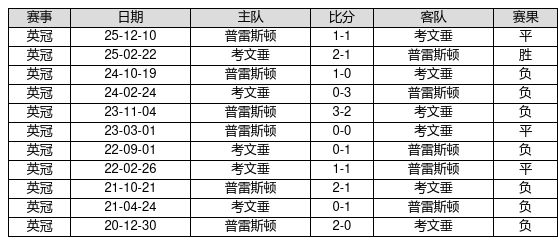 考文垂 VS 普雷斯顿两队近10年的交战次数为11场,考文垂1胜3平7负,赢球概率为9.1%,平局概率为27.3%,输球概率为63.6%。
