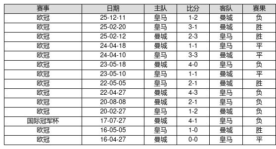 皇马 VS 曼城两队近10年的交战次数为14场,皇马4胜4平6负,赢球概率为28.6%,平局概率为28.6%,输球概率为42.9%。